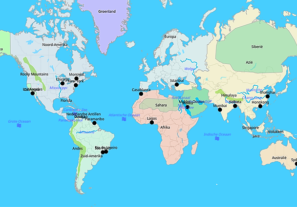 Kleine kaart Wereld, steden, gebieden en wateren (640x480)