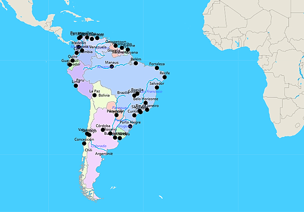Kleine kaart Zuid-Amerika met steden en water (640x480)