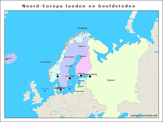 Topografie Noord-Europa landen, hoofdsteden en wateren
