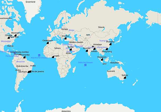 Topografie wereld steden, gebieden en wateren