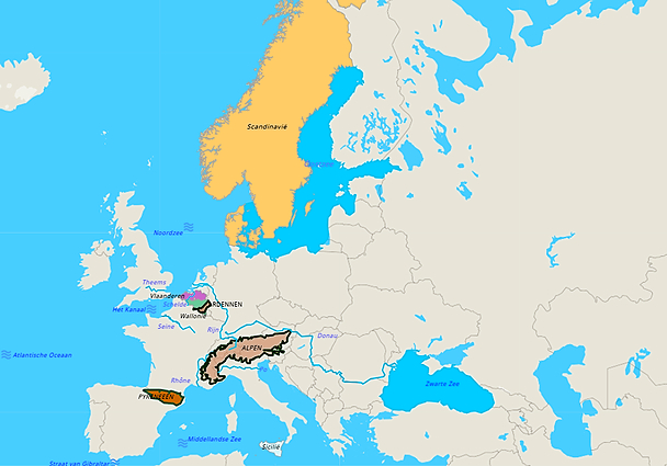 Kleine kaart Europa wateren gebieden en gebergten (640x480)