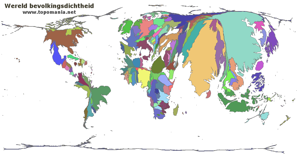 Dit is niet de wereldkaart zoals je die kent. De landen op de kaart zijn ernstig vervormd. Maar het is geen willekeurige vervorming die je ziet. De landen zijn vervormd naar ratio van de bevolkingsdichtheid. Zo'n kaart noem je een cartogram.