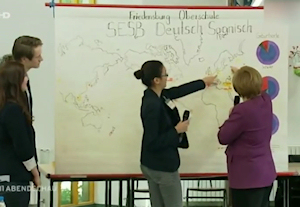 Tijdens een bijeenkomst wordt Angela Merkel gevraagd om Berlijn aan te wijzen op een wandkaart. Ze zoekt met haar vinger op de kaart en komt ergens in Rusland terecht.