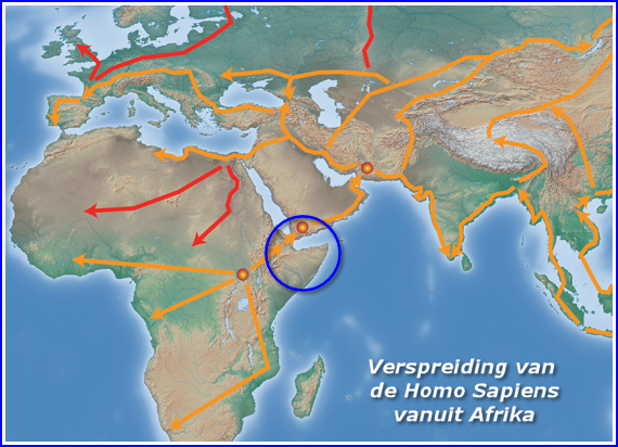Wetenschappers vandaag de dag geloven dat de Homo Sapiens, onze verre voorouder, zo'n 200.0000 (tweehonderdduizend) jaar geleden is ontstaan in de Hoorn van Afrika. Ze denken dat een groep Homo Sapiens zo'n 60.000 jaar geleden vertrok vanuit Ethiopië en de rest van de wereld heeft veroverd. Als je de kaart bekijkt zie je een strook water tussen de Hoorn van Afrika en het Arabische schiereiland. Dit water is ongeveer 23 kilometer breed, maar was 60.000 jaar geleden veel smaller en 70 meter minder diep. Misschien zijn de eerste mensen op vlotten van eilandje naar eilandje gevaren en zo aan de overkant gekomen.