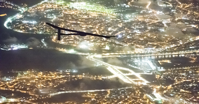 Het silhouet van de Solar Impulse bij aankomst boven Rabat © Solar Impulse, Jean Revillard