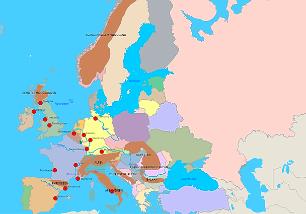 Geography V2 TBL Topo Europa grote steden wateren, gebergtes