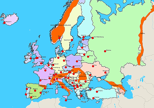 Kleine kaart 2HV Europa steden en gebergtes (640x480)