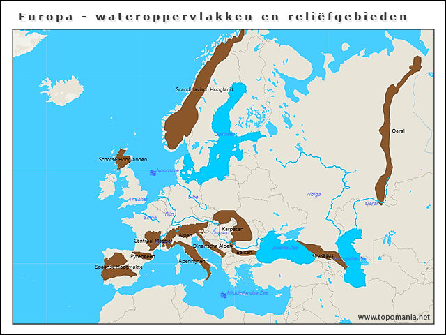 Topografie Europa - wateroppervlakken en reliëfgebieden