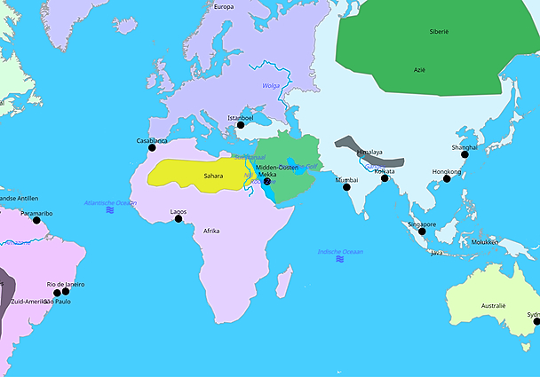 Kleine kaart Wereld steden, gebieden en wateren (640x480)