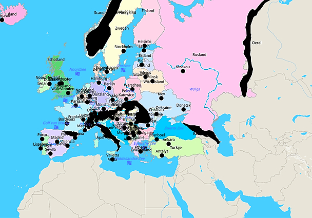 Kleine kaart Europese landen, steden, wateren en gebergten (640x480)