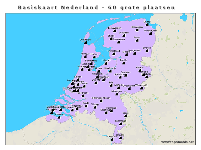 Kleine kaart Basiskaart Nederland - 60 grote plaatsen (640x480)
