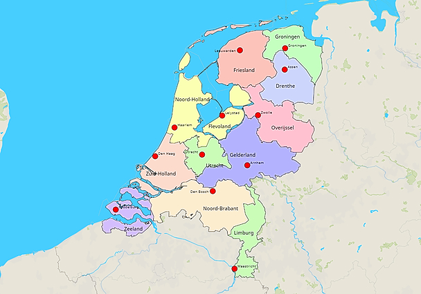 Kleine kaart Topografie provincies en hoofdsteden Nederland (640x480)