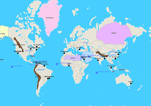 Topografie Wereld steden, gebieden en wateren