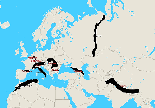 Kleine kaart Gebergten en heuvels WERELD (640x480)