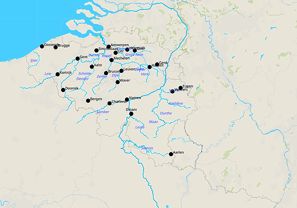 Kleine kaart Hydrografie België rivieren - hoofdsteden (640x480)