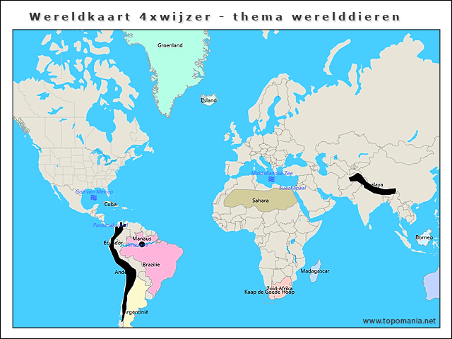 Topografie Wereldkaart 4xwijzer - thema werelddieren