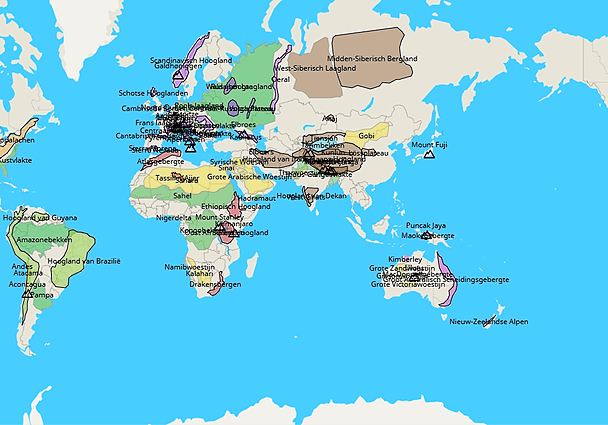 Topografie Wereld-Gebergtes, plateaus, vlaktes en woestijnen