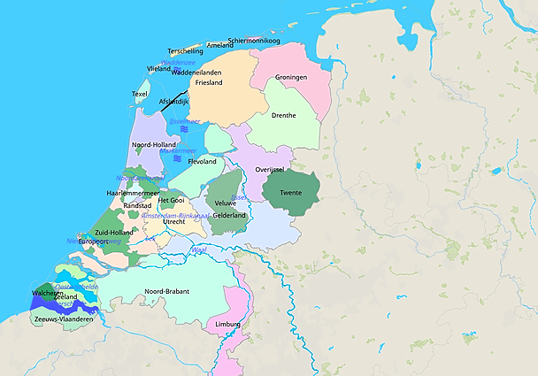 Topografie kaart met water,provincies,eilanden,landstreken