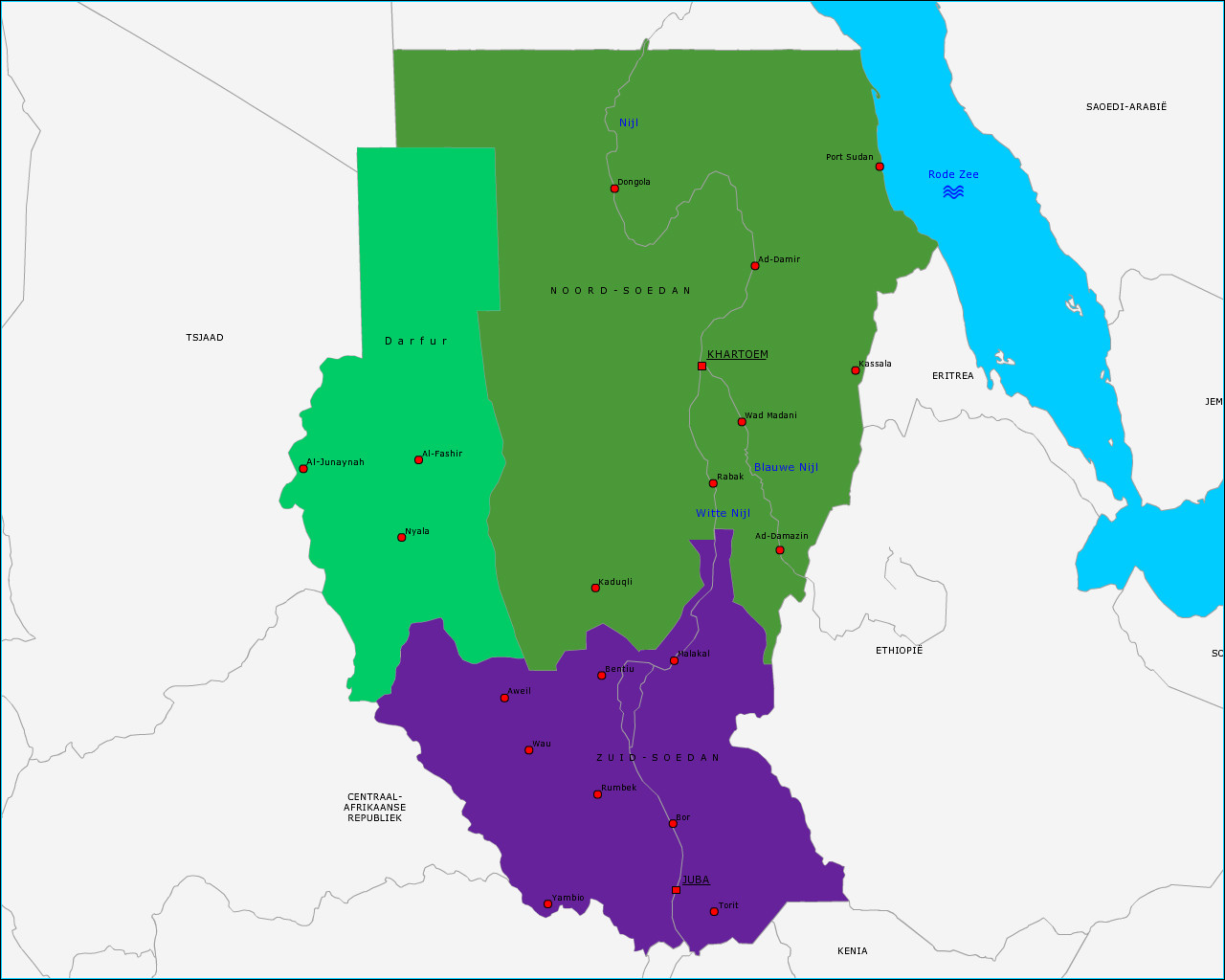Kleine kaart Zuid-Soedan en Noord-Soedan (640x480)