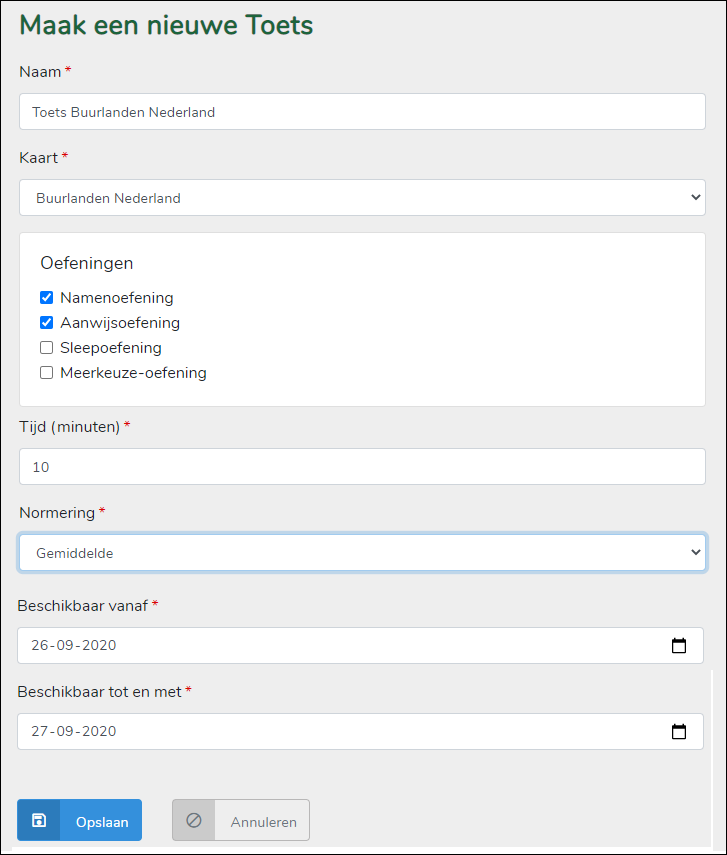 Geef de toets een naam en kies de kaart waarvoor de toets bedoeld is.