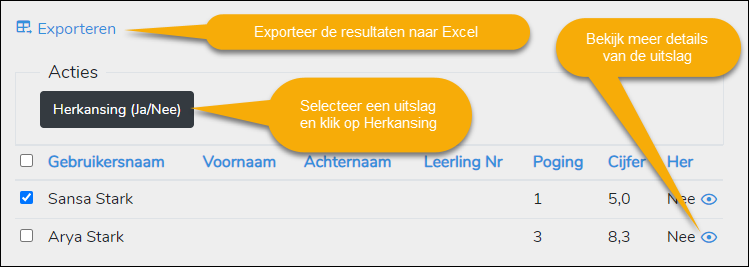 Je kan een toets voor een gebruiker opnieuw open zetten door vanuit de lijst met toetsuitslagen de uitslag te selecteren en de knop Herkansing te gebruiken. Je kan zovaak herkansingen geven als gewenst is.