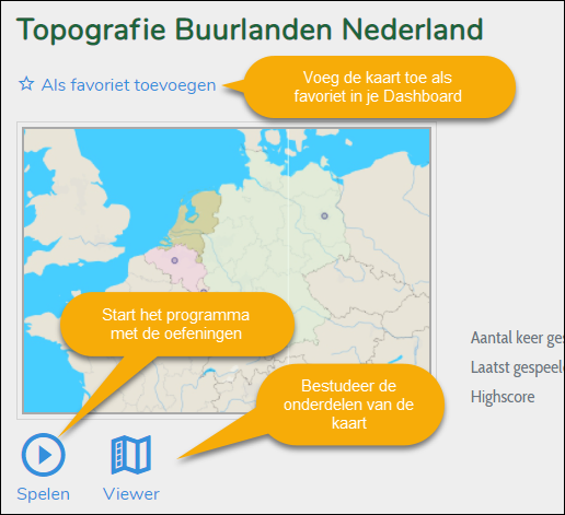 Je kan vanaf hier ook de inhoud van de kaart bekijken in een Viewer zonder oefeningen. Als je de kaart vaker gaat gebruiken kan je deze kaart toevoegen aan je favorieten. Hij verschijnt dan op de Home page van TopoMania in de lijst met favorieten van je Dashboard.