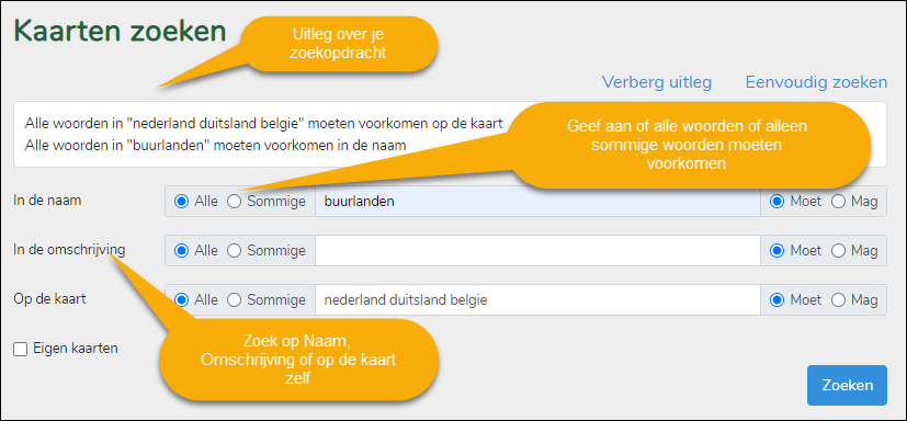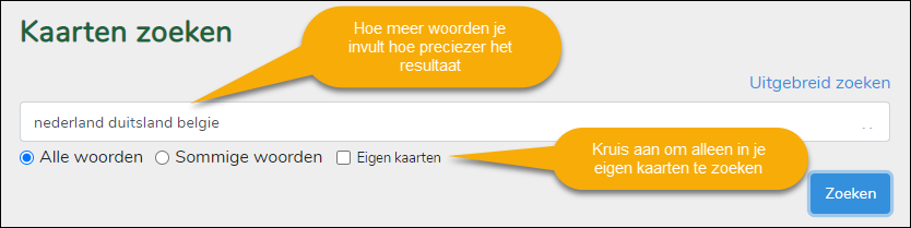 Je kan ook uitgebreid zoeken naar kaarten. Klik hiervoor op de link Uitgebreid zoeken. Bij uitgebreid zoeken kan je aangeven waar je wilt zoeken. Je kan zoeken in de naam van de kaart, de omschrijving en op de kaart zelf. Je kan ook aangeven of er naar alle woorden of alleen sommige woorden uit je zoekopdracht wordt gezocht.