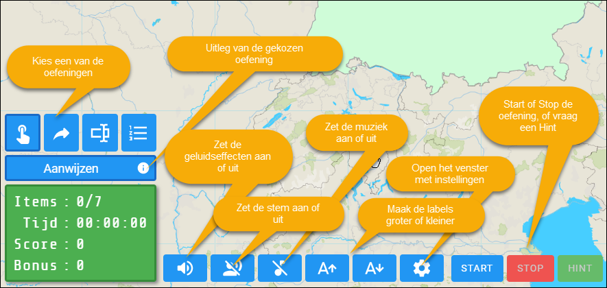 In deze oefening moet je met de muis het gevraagde onderdeel op de kaart aanklikken. Hoe sneller je de oefening uitspeelt hoe meer bonuspunten je kan verdienen. Als je een hint wil klik je op de Hint knop. Je krijgt dan drie opties te zien waarvan een de juiste is. Als je nog een keer op de Hint knop klik krijg je twee opties te zien waaruit je kan kiezen. Als voor de derde keer op de hint knopt druk laat het programma je zien wat de juiste optie is en krijg je de volgende vraag.