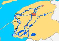 Kaart met steden, vaarten, rivieren en meren van de Elfstedentocht route